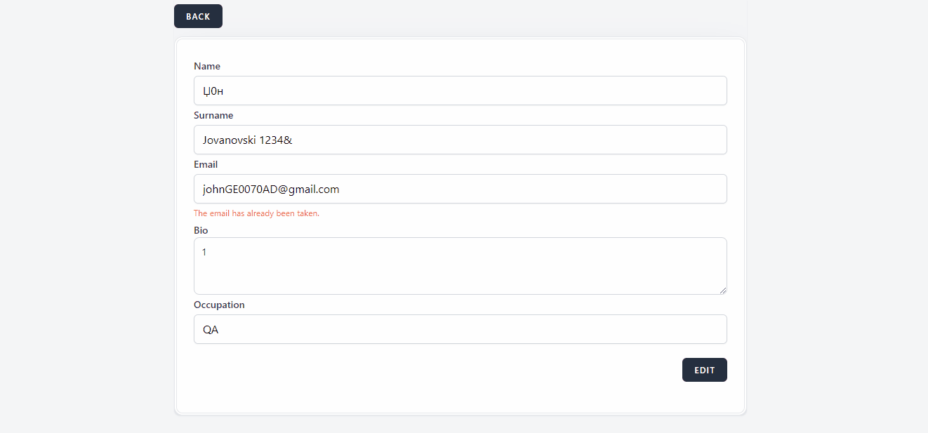 The "Mentor" should not be edited, and a message should be shown ''name field is requierd'' in red letters; ''suname field is requierd'' in red letters; ''bio field is requierd'' in red letters; ''occupation field is requierd'' in red letters.