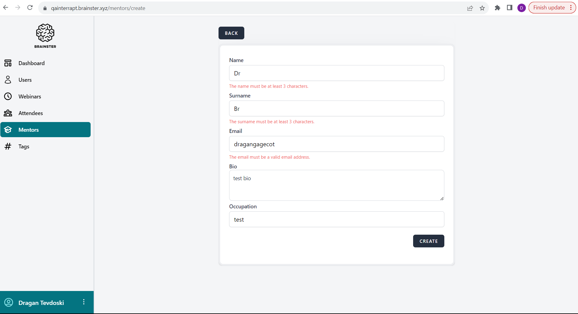 Should return a validation message that says: "must be at least 5 characters" for "Occupation" input field, according to the criteria and the mentor should not be created
