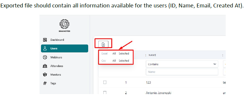 By exporting users to Excel and CSV format, users should have the following information (ID, Name, Email, Created). In this case, another user information appears that should not exist according to the User story