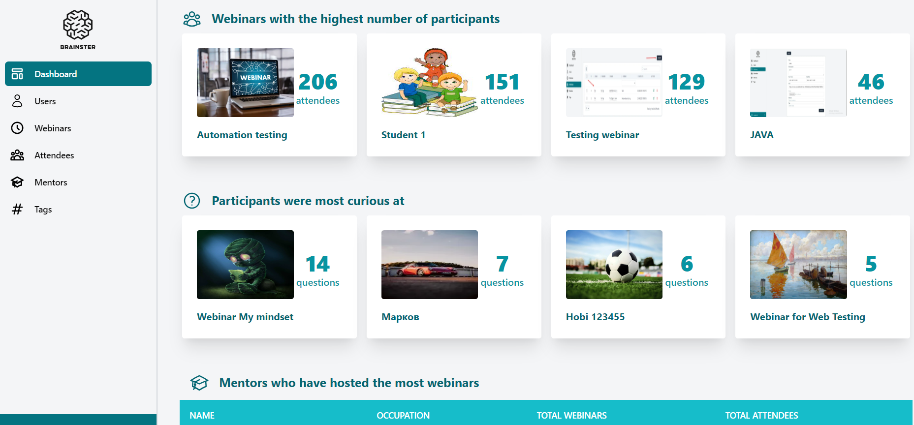 The user should be able to see upcoming scheduled webinars on dashboard, apart from the available information about: webinars with the highest number of participants, most curios at, and mentor who have hosted most webinars.