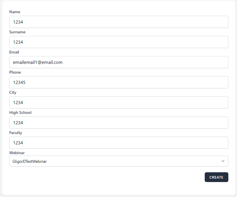 4. Enter numbers (1234) in the field "Name","Surname","Phone","City","High School","Faculty"