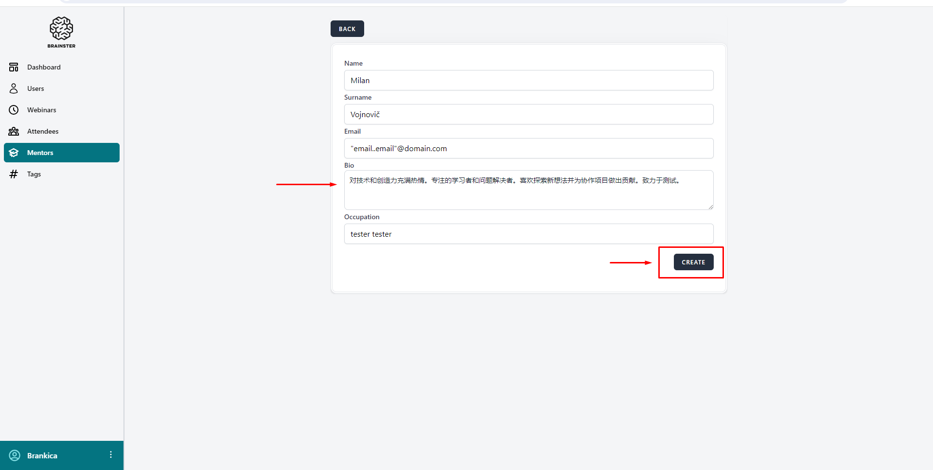 - Subject changed from Mentor is created by entering above maximum characters in name and surname to Mentor created with non-Latin and non-Cyrillic letters in bio field