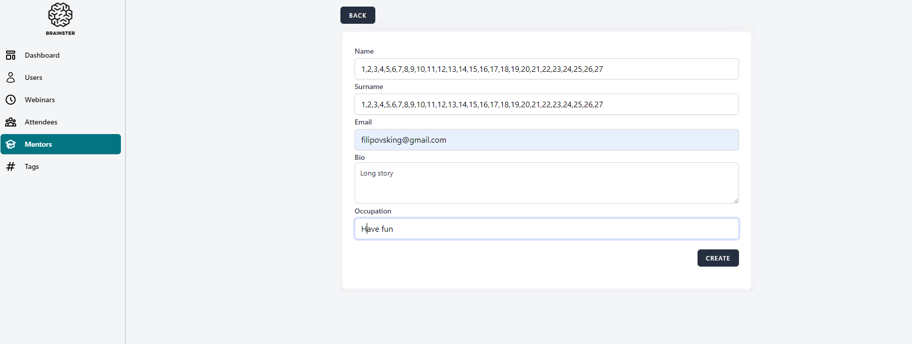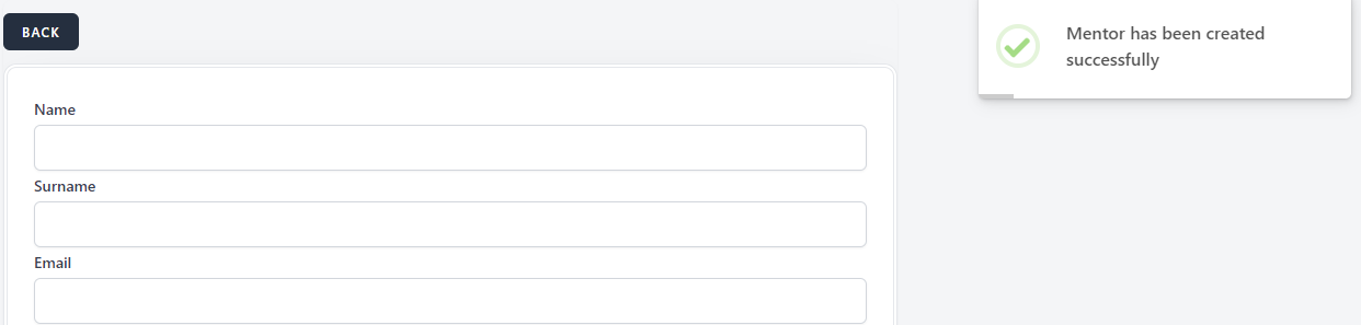User should not be able to create new Mentor and a warning message with red letters under the "Name" field should appear