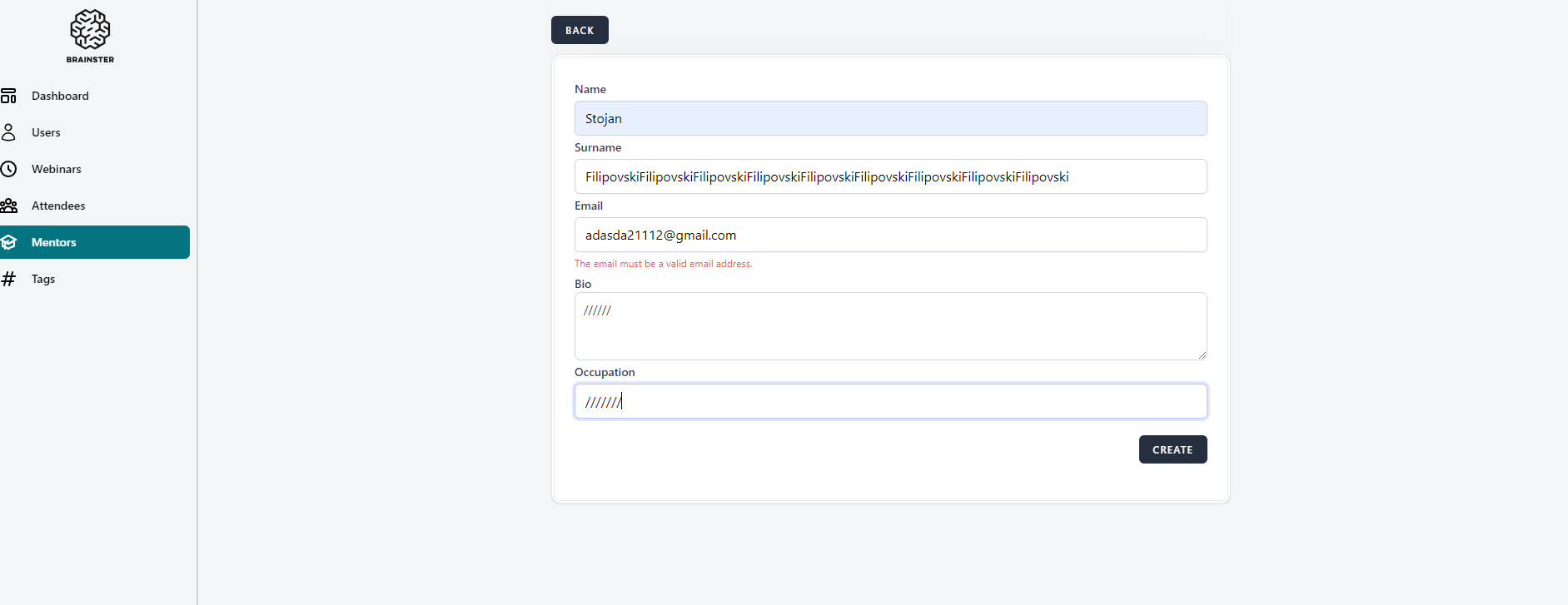User should not be able to create new Mentor and a warning message with red letters under the "Surname" field should appear