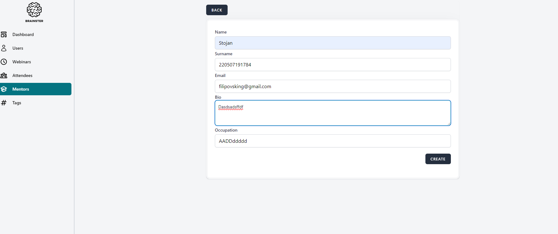 User should not be able to create new Mentor and a warning message with red letters under the "Surname" field should appear