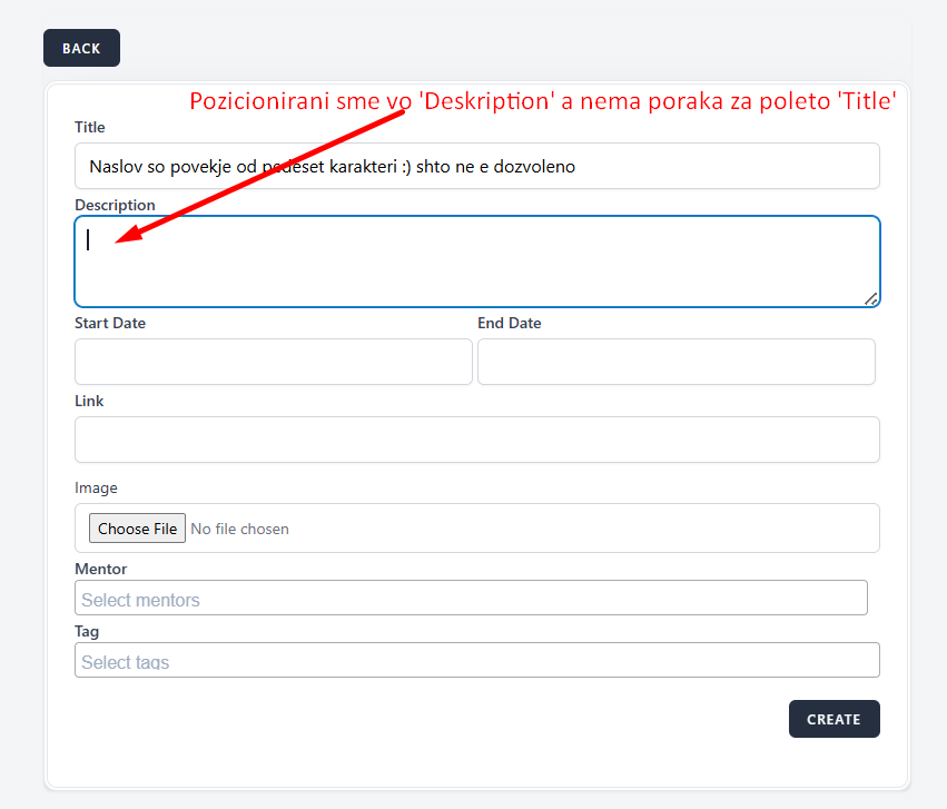 When in the field 'Title' we enter less than 5 characters or more then 50, a number and a special character that is not allowed according to the specification, and when we move the cursor to the next field 'Description' we should receive a message in red letters