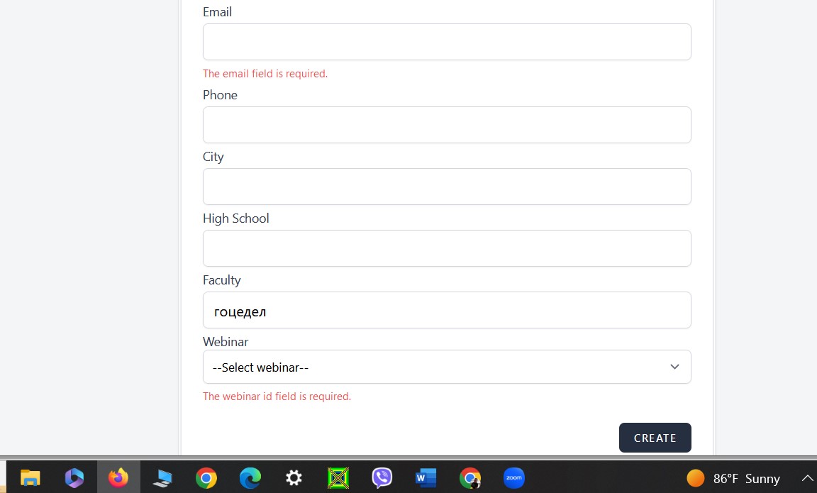 Upon not filling out the "Faculty" field and clicking on the 'Create' button, does not display an error message that the field is empty.