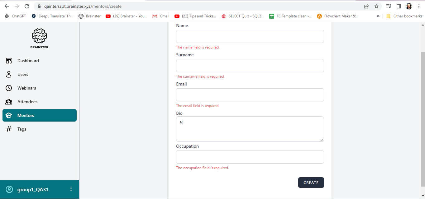 User is logged in and navigated to https://qainterrapt.brainster.xyz/