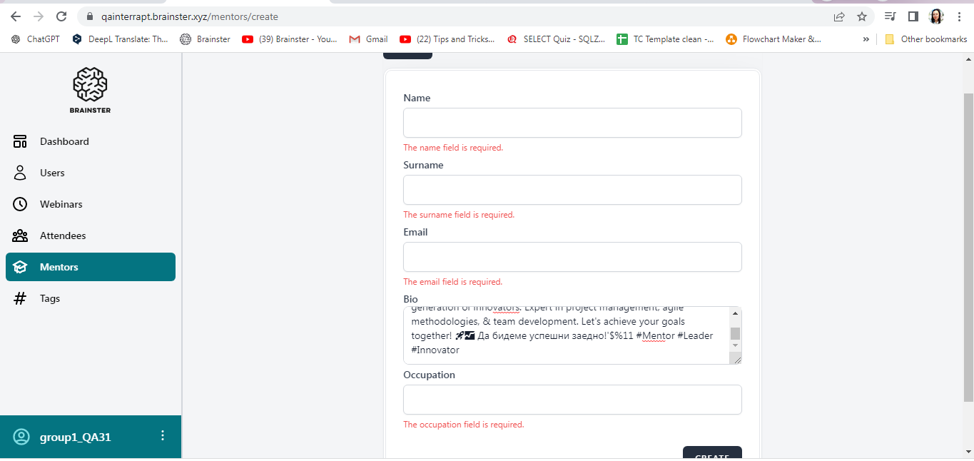 [Mentors] When attempting to create a mentor, the user experience an issue filling in the bio field. A message indicating that the bio field must be a minimum of 20 and maximum of 300 characters in length and cannot contain special characters other than "-" and "." is not displayed. The field is successfully filled with more than 25 characters and contains other special characters and numbers.