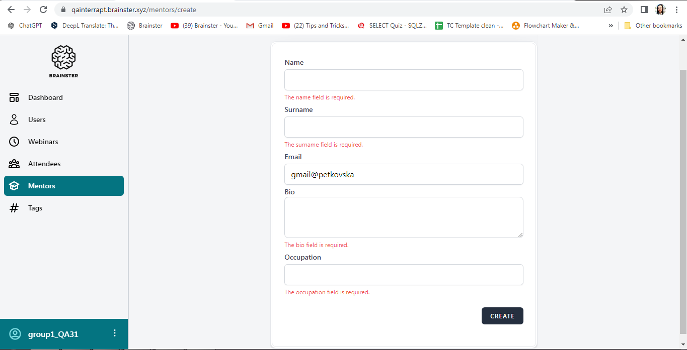User is logged in and navigated to https://qainterrapt.brainster.xyz/