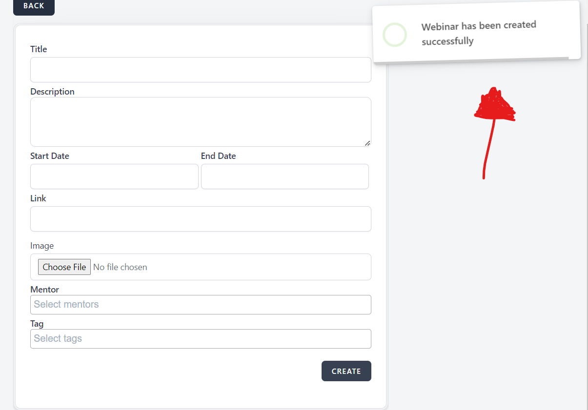 After the User clicks on "Create" button with invalid inputs (in this case an invalid start and end date which is an impossible timeline), it should not allow the user to create a webinar, and a message with red letters should appear indicating that the given input is invalid.