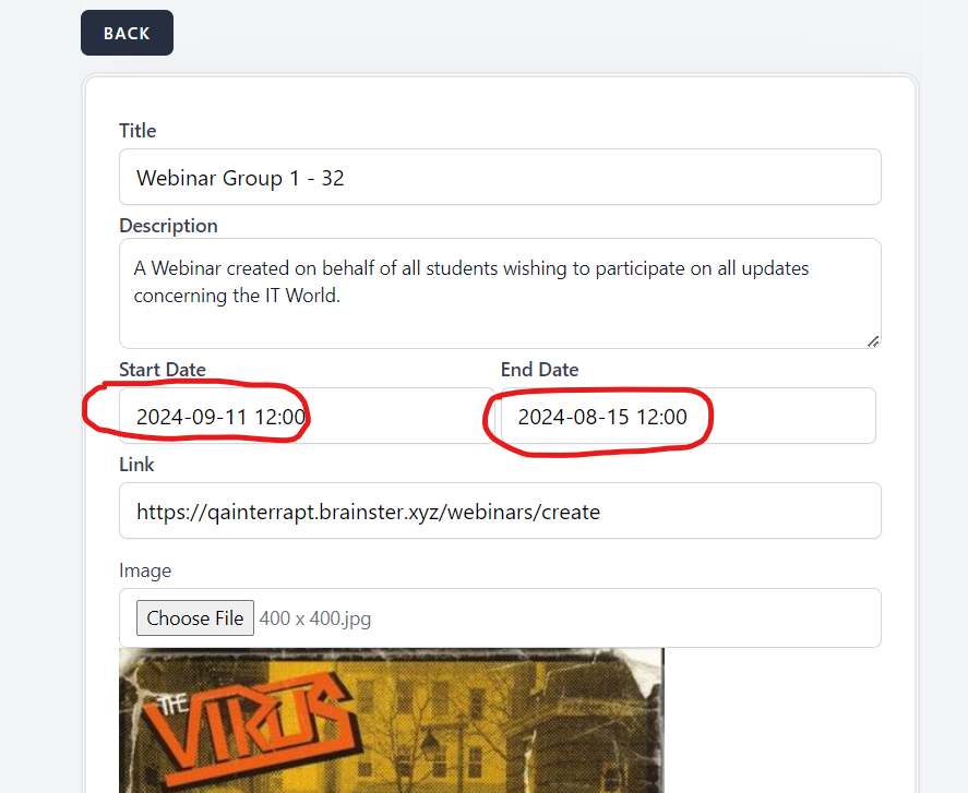 The User is able to create a webinar even when the start Date does not correspond with End date, furthermore, it allows the user to actually select a start date a month after the end date is selected.