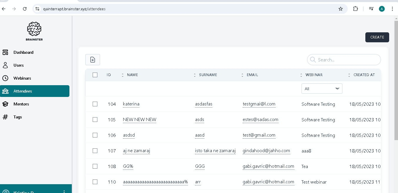 The User is logged in as a regular user on the "Attendees" page, with a record of attendees that can be deleted.