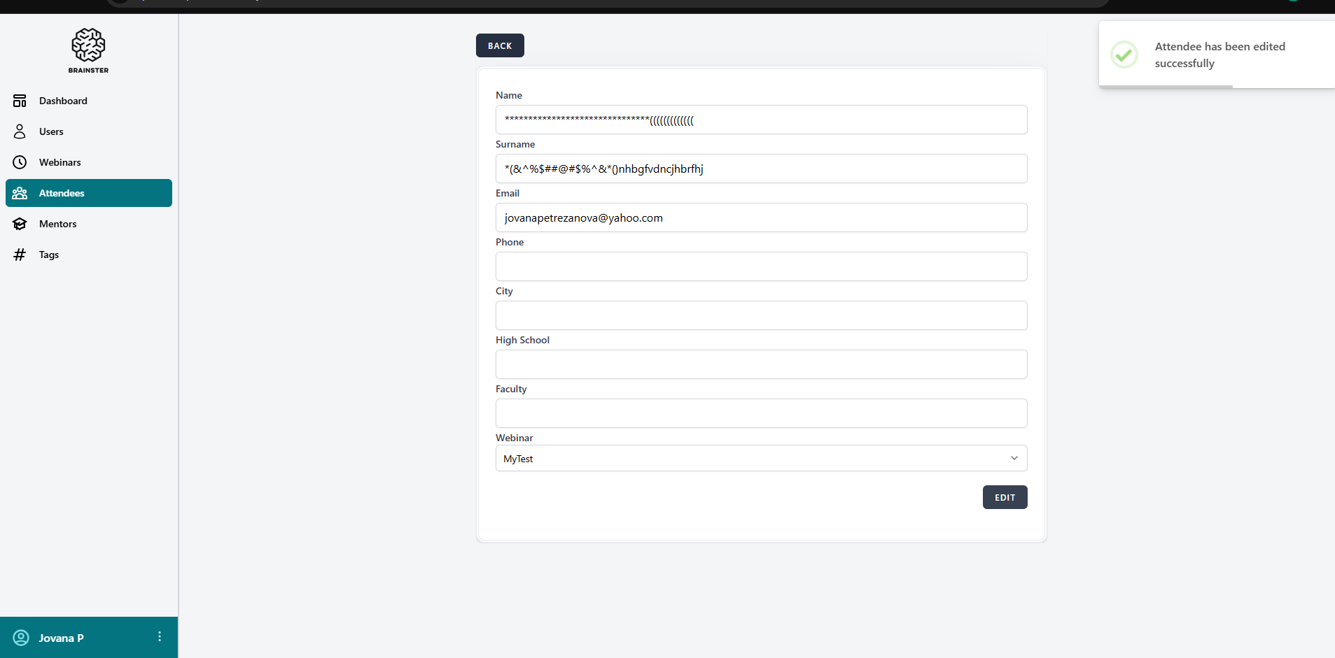 - Subject changed from [Attendees] By entering invalid characters in the field "Name" and "Surname" an account should not be created and an error message should be displayed to [Attendees] By entering invalid characters in the field "Name" and "Surname" an account i created successfully