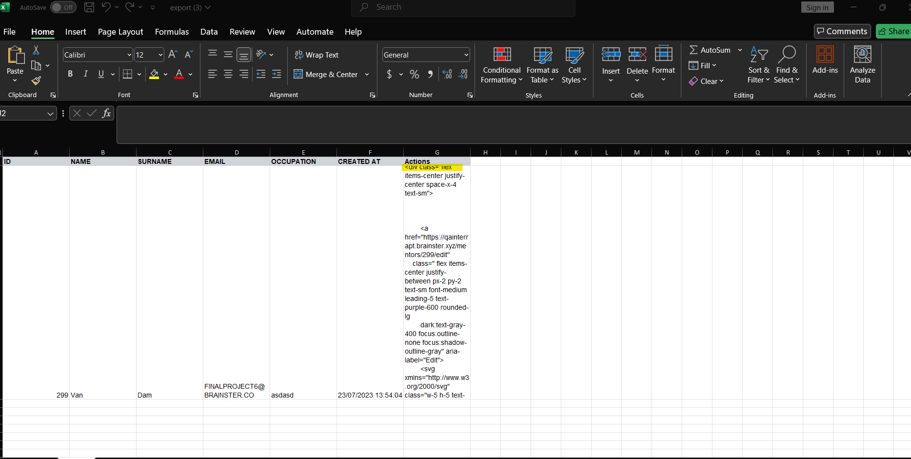 Irrelevant column information for Action is displayed in the report with code data redundant for the user. Report should only retreive data for relevant columns: ID , Name , Surname , Email , Bio , Occupation , Created AT .