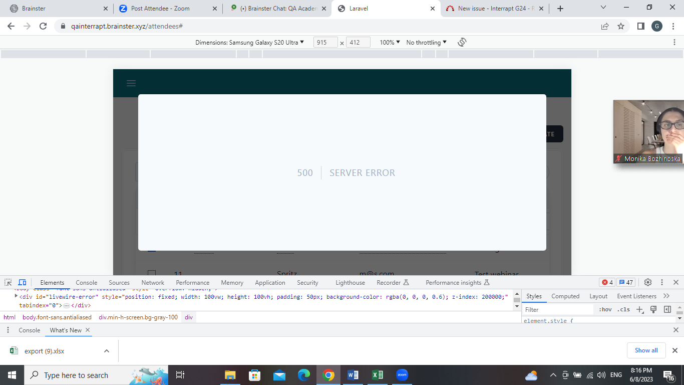 Environment: https://qainterrapt.brainster.xyz/attendees# , Browser: Google Chrome 114.0.5735.110, Device: Samsung Galaxy S20 Ultra