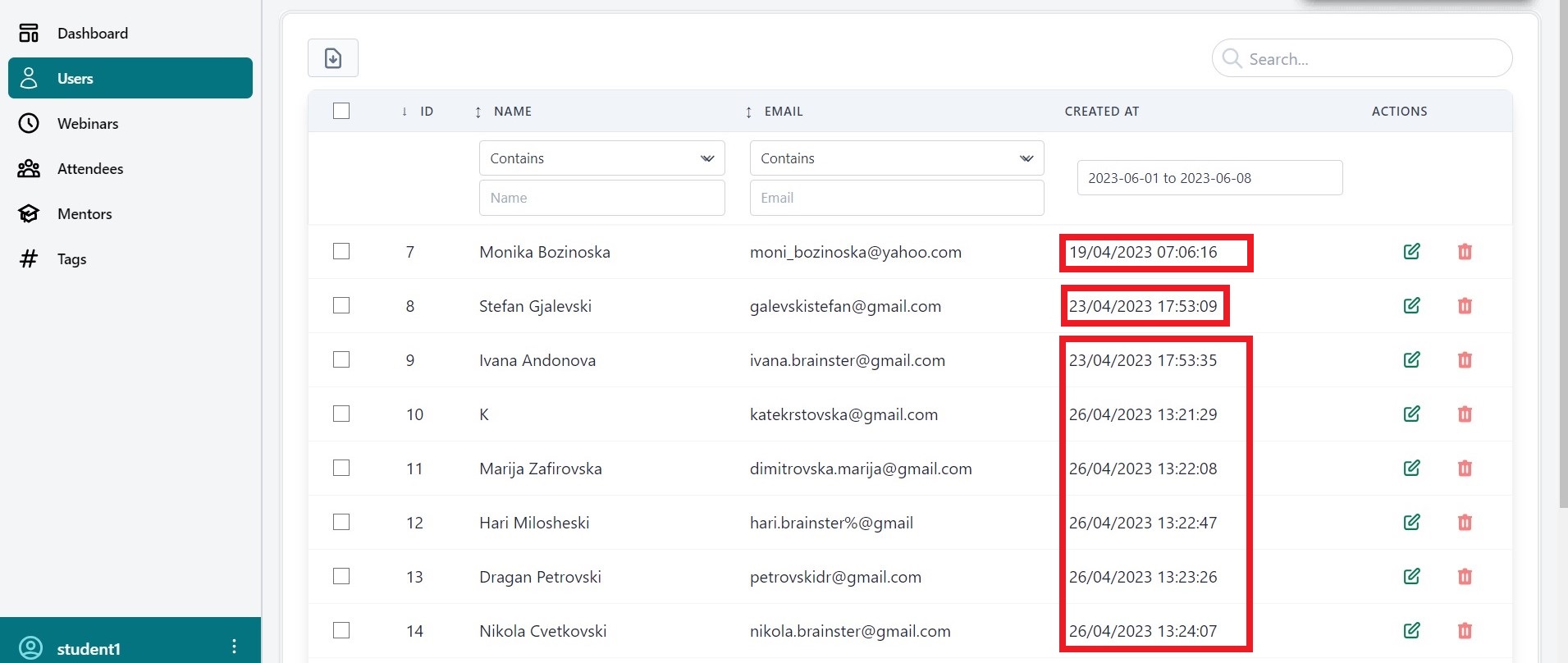 Actual Result : The list shows all created users without considering the selected date range from the date picker. (Example: A user created on 19/04/2023 07:06:16 is listed.)