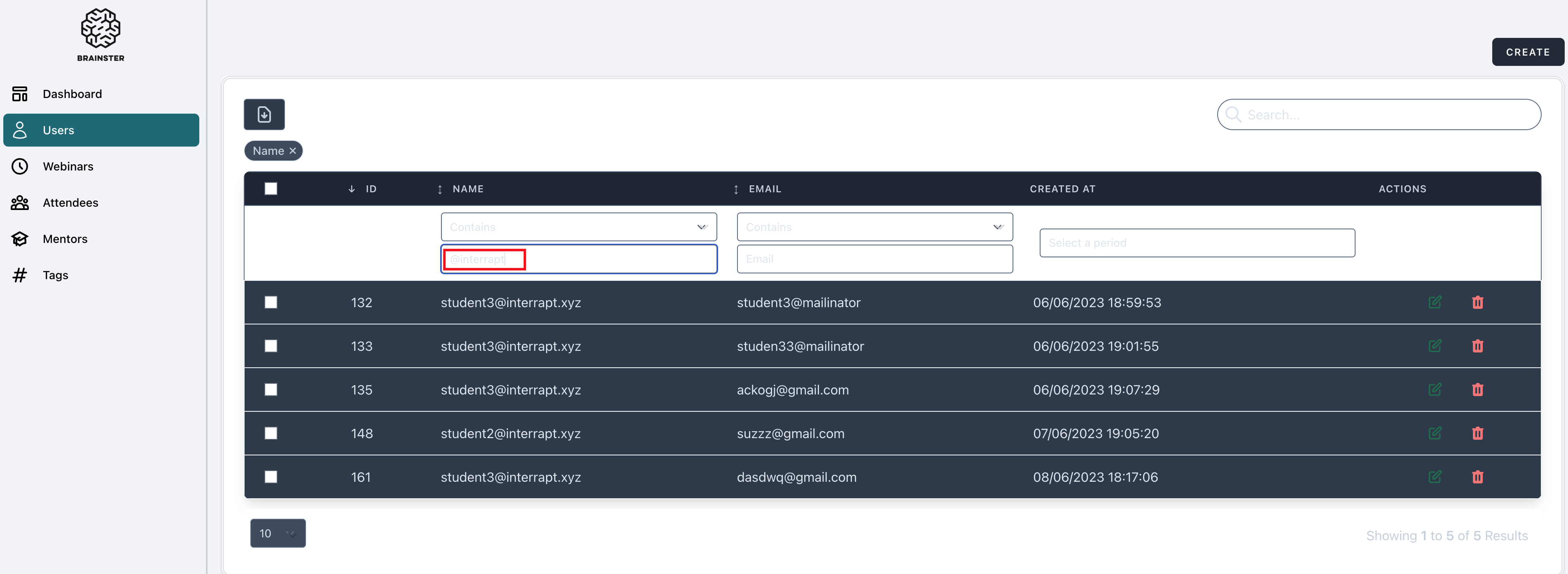 5. Insert invalid special character in the Name search input field (@interrapt)