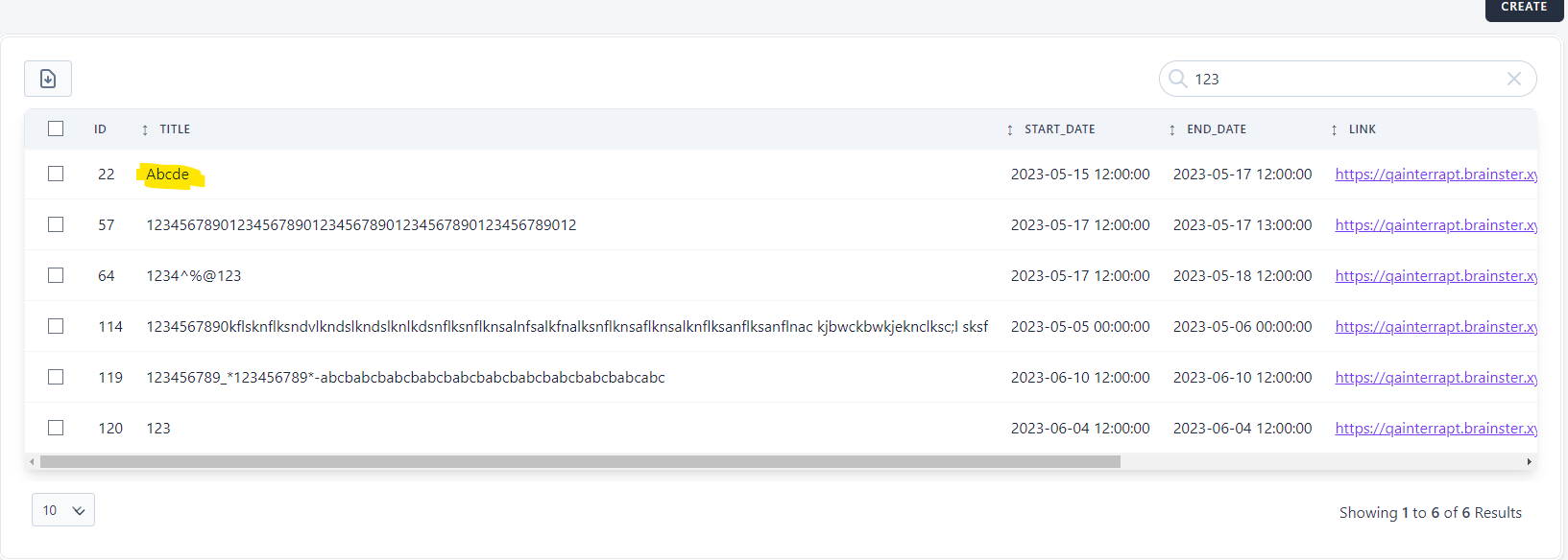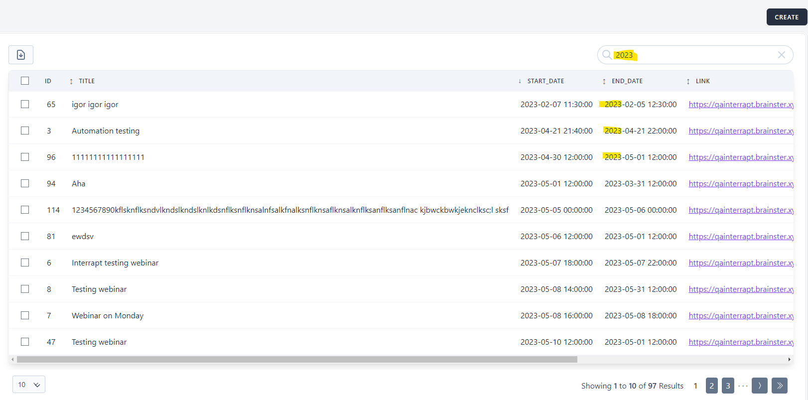 1.Webinars created in 2023, regardless of their title information are displayed. Search option displays results where 2023 is contained in webinar data in any column in the grid.